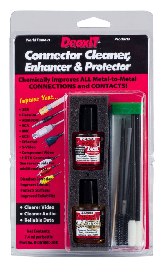 Dual pack with one 7.4ml bottle (50mm high) of DeoxIT D100L-2DB and one 7.4ml bottle of DeoxIT Gold G100L-2DB. This kit is best for delicate equipment where the application must be applied precisely. Remember that all excess must be cleaned off delicate equipment!